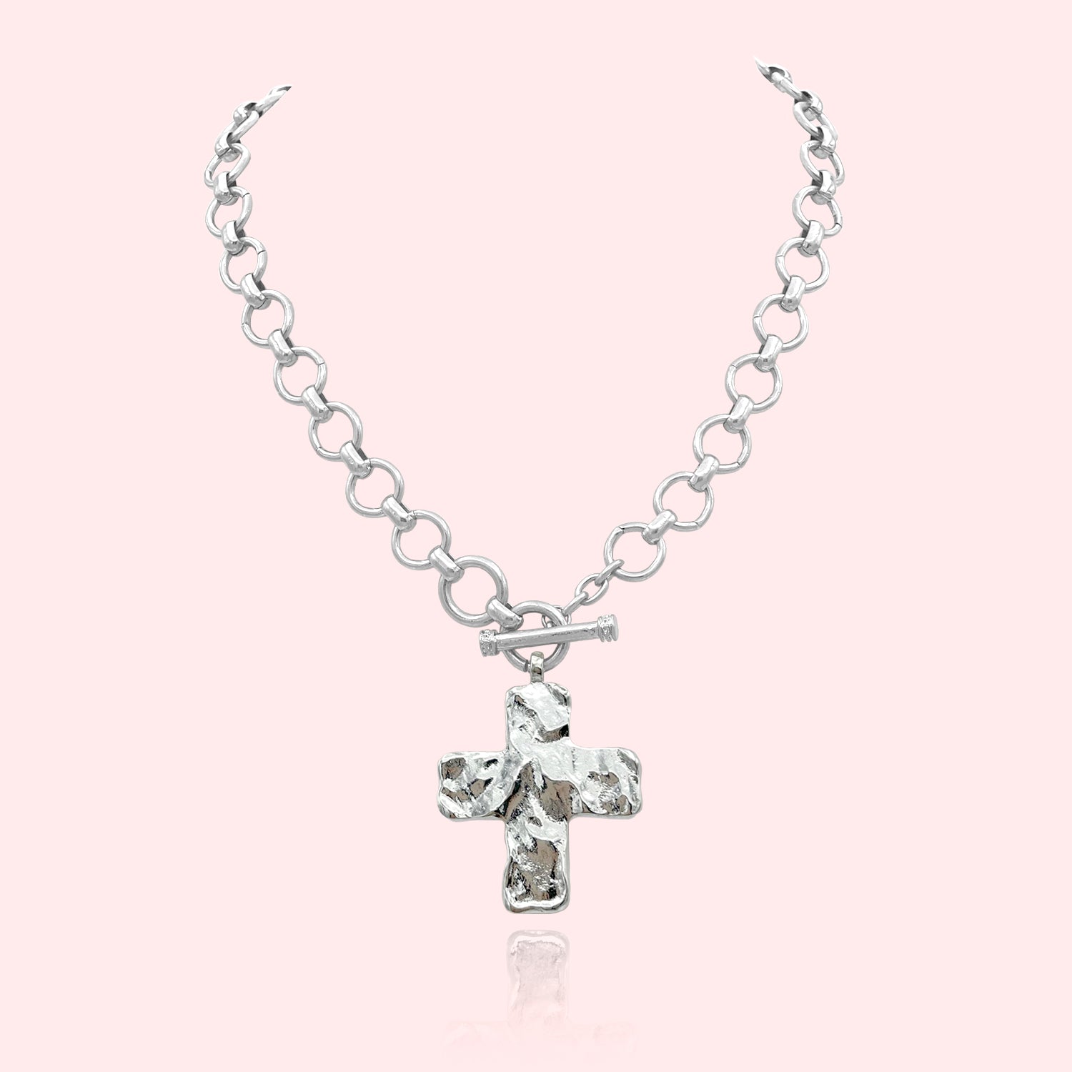 Hammered Bold Cross Necklace Thick Chain Set, Chunky Cross Statement Pendant Toggle Necklace, Handmade Toggle Hammered TextureCross Necklace